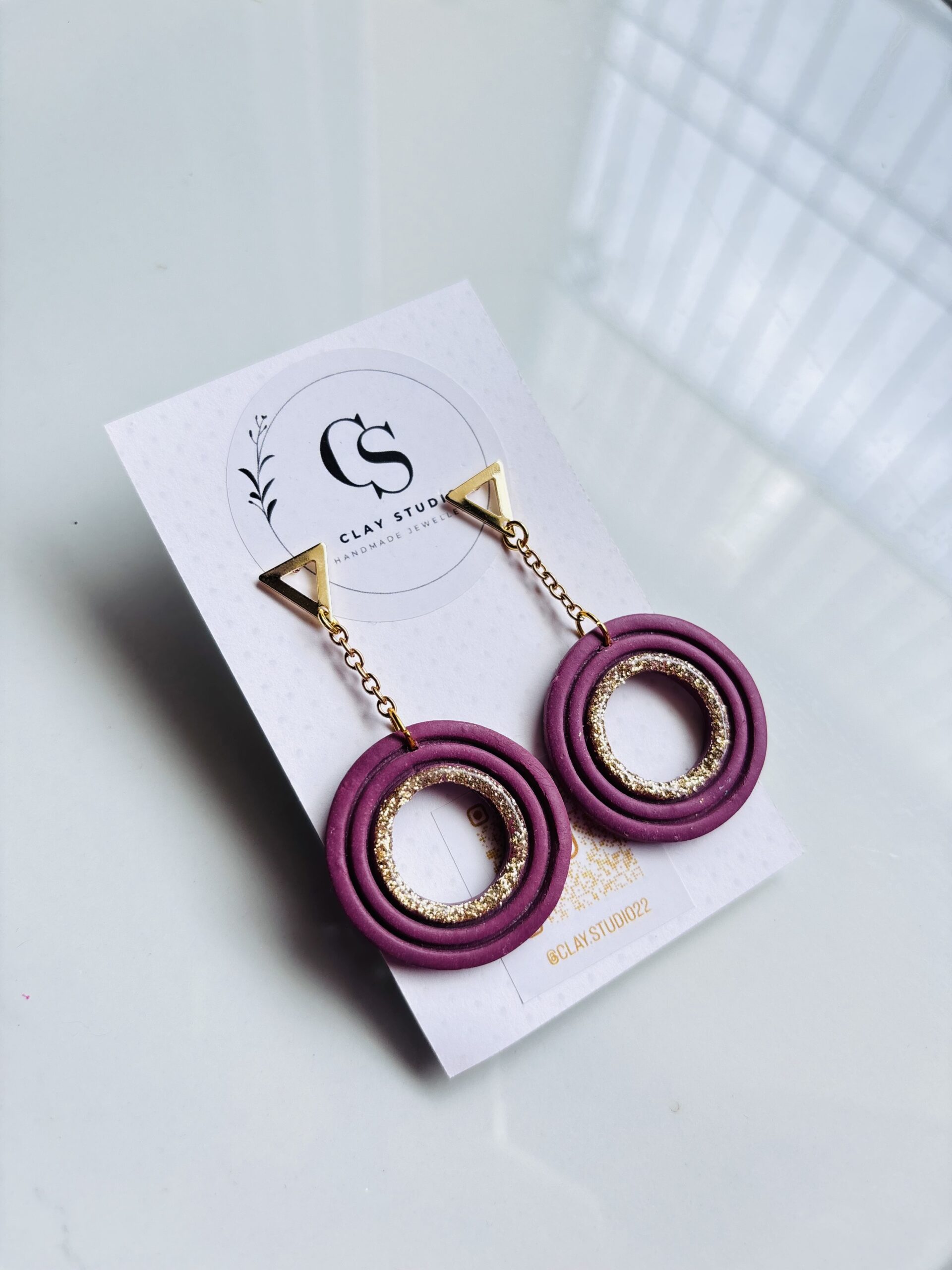 Make a bold statement with our Berry Gold Orbit Earrings – a stunning blend of elegance and edge. These handcrafted earrings feature double concentric polymer clay rings in a rich berry hue, accented by an inner circle dusted with shimmering gold glitter. The design is suspended from sleek gold-toned triangle studs and delicate chain links, creating movement and modern flair.